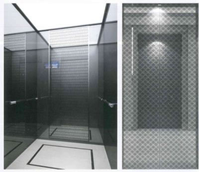 轎壁:后壁中間黑鈦金鏡面蝕刻兩側黑鈦鏡面不銹鋼,側壁黑鈦鏡面不銹鋼,底部黑鈦發紋不銹鋼踢腳線